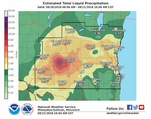 On August 20-21, a low pressure weather system rotated over the area producing 11-15 inches of rain in areas of Western Dane County. (National Weather Service) Click to enlarge image.